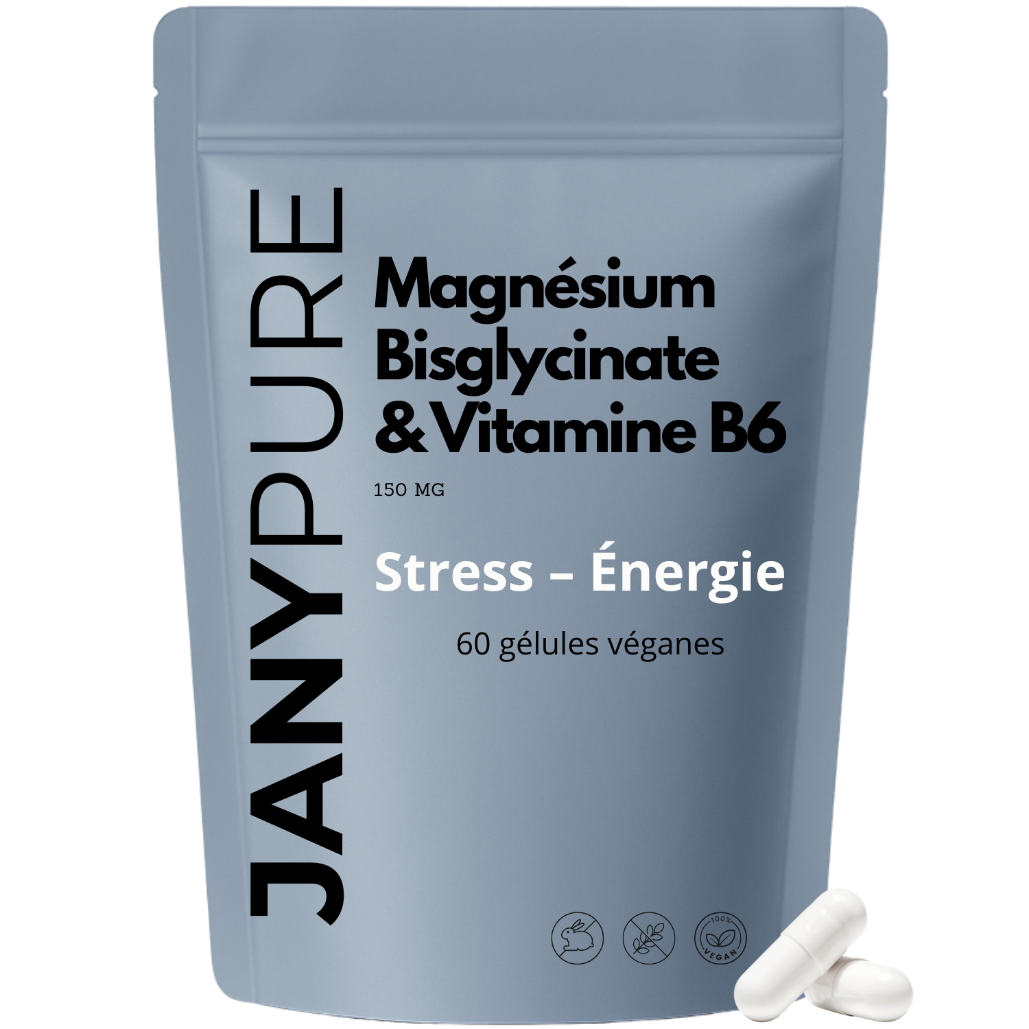 Notre Magnésium Bisglycinate JANYPURE change tout. Le magnésium est lié à deux molécules de glycine, créant une forme chélatée hautement biodisponible (80-90% d'absorption) sans effets secondaires digestifs. La vitamine B6 renforce l'action du magnésium en facilitant son entrée dans les cellules et en optimisant son utilisation par l'organisme.