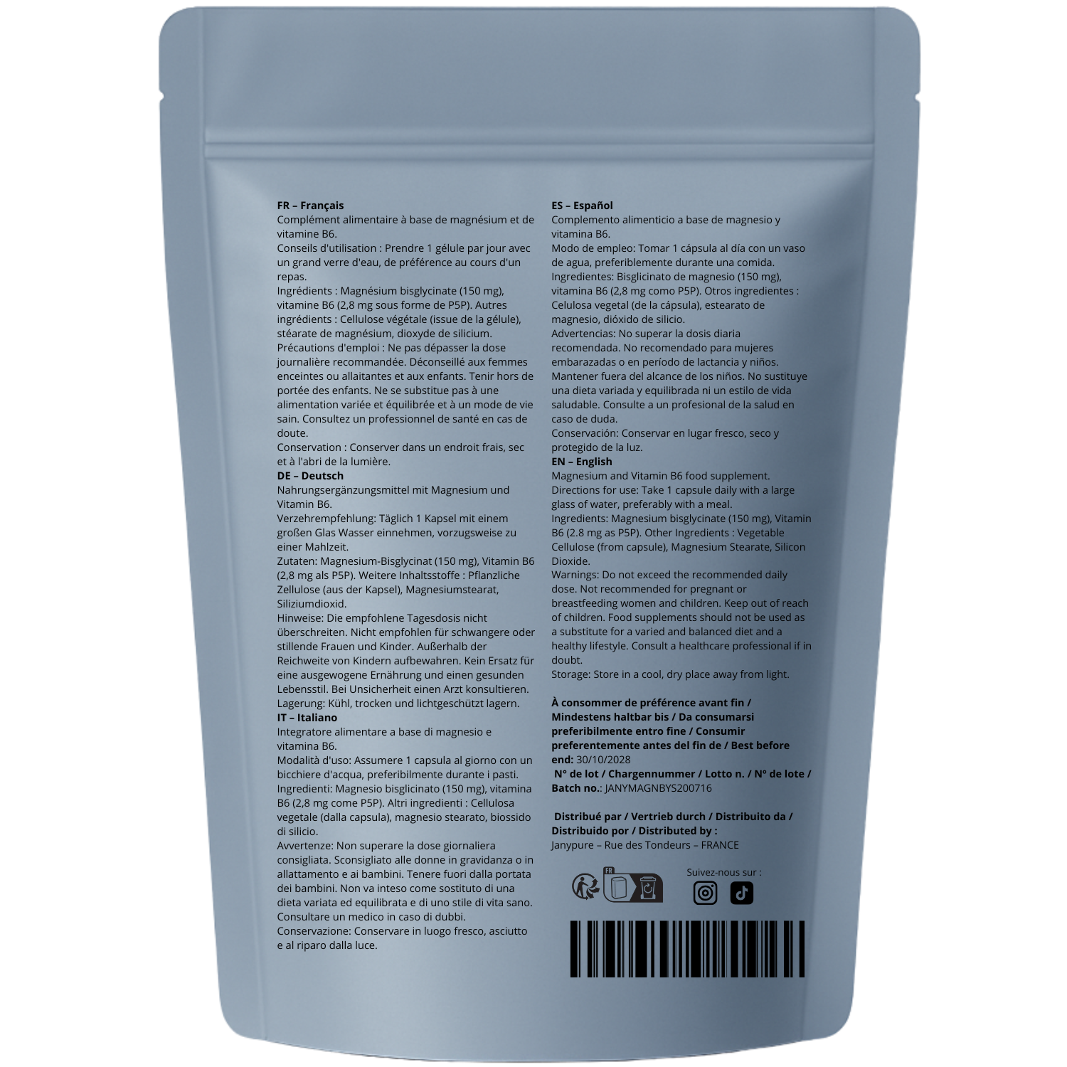 Notre complément Magnésium Bisglycinate & Vitamine B6 JANYPURE apporte un dosage optimal pour combler vos besoins quotidiens et retrouver calme, énergie et bien-être.